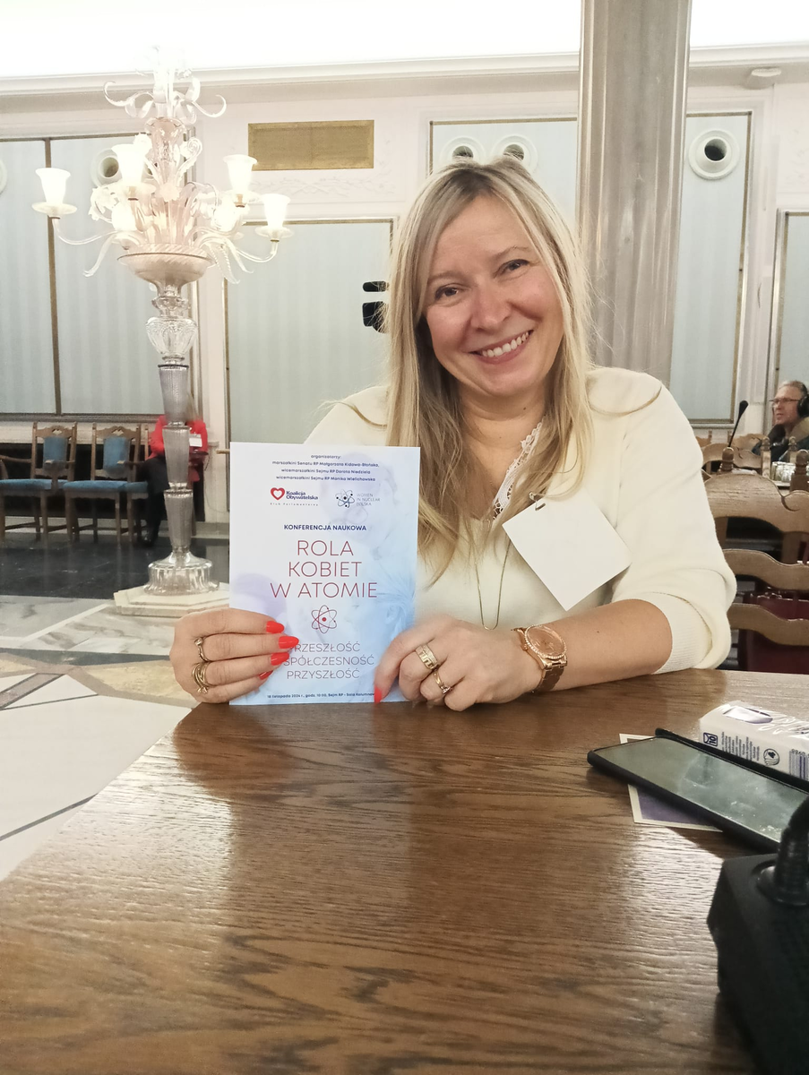 W poniedziałek 18. listopada 2024 r. uczestniczyłam w konferencji naukowej "Rola kobiet w atomie. Przeszłość. Współczesność. Przyszłość", która odbyła się w Sejmie Rzeczypospolitej Polskiej, w Warszawie. W bieżącym roku przypada 90. rocznica śmierci profesor Marii Skłodowskiej-Curie, laureatki dwóch Nagród Nobla i konferencja była poświęcona jej dokonaniom.