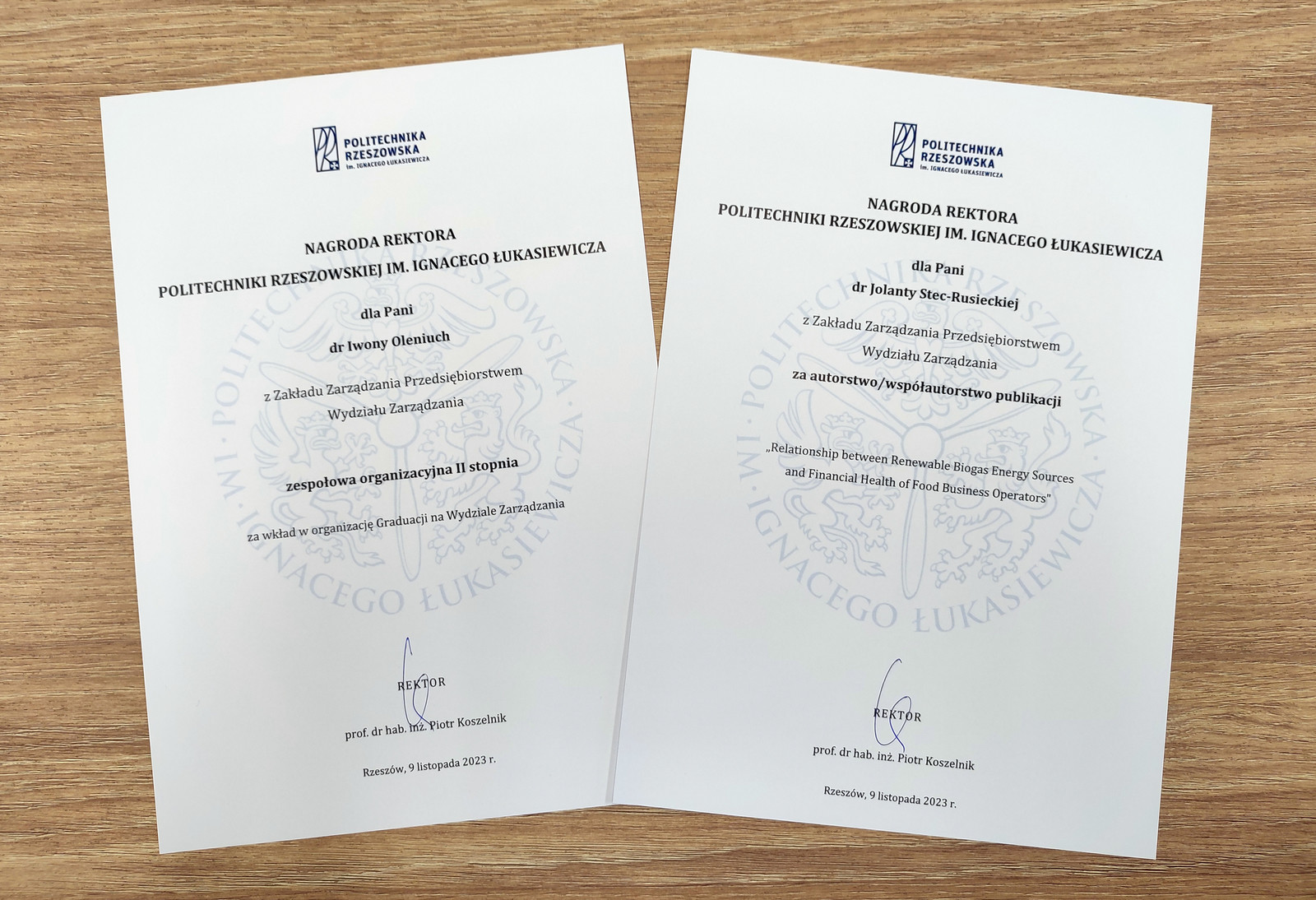 Nagrody Rektora Politechniki Rzeszowskiej otrzymały dwie osoby z naszego zespołu: