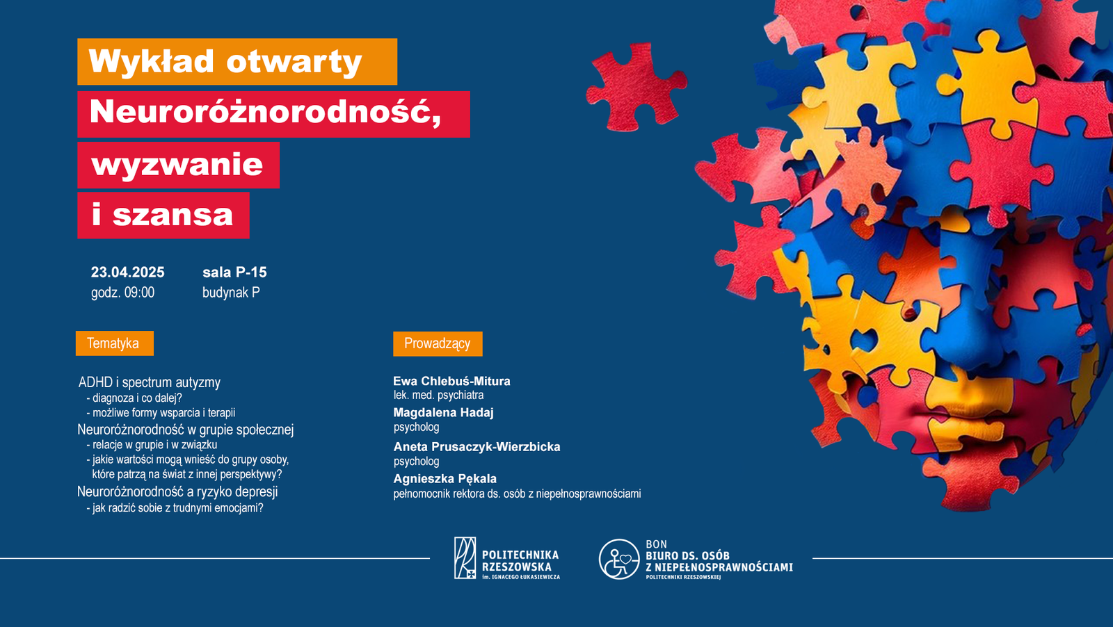 W dniach 23. kwietnia 2025 r. oraz 7. mają 2025 r. uczestniczyłyśmy w wykładzie otwartym i w warsztatach poświęconych neuroróżnorodności. Projekt realizowany przez Biuro ds. Osób z Niepełnosprawnościami Politechniki Rzeszowskiej (BON) ma na celu zapoznać zarówno pracowników uczelni, jak i jej studentów z aktualną wiedzą na temat funkcjonowania osób z ADHD i spektrum autyzmu w środowisku akademickim.
