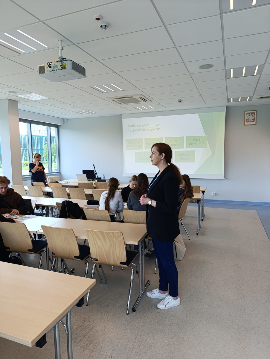 W dniach 13. i 15. maja 2025 r., w ramach stażu odbywanego na naszym wydziale, dr Justyna Grześ-Bukłaho z Politechniki Białostockiej, zrealizowała zajęcia z przedmiotu "Innowacje i innowacyjność" na kierunku Inżynieria procesów biznesowych. Ćwiczenia miały charakter projektowy a prowadząca wykorzystała grę szkoleniową "Roboty".